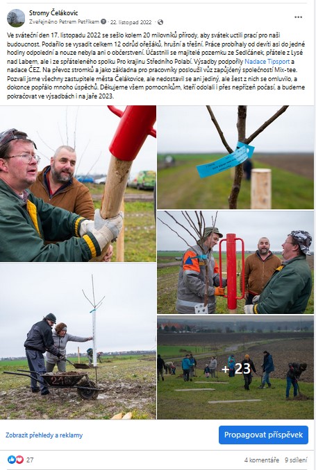 Pro nadaci Tipsport proběhly 28. 10. 2022 přípravné práce na výsadbu (zaměření pozic a zamezení vjezdu vozidlům na nelegální cestu vystavěním kamenné zídky). 16. 11. 2022 jsme zakoupili 12 ks stromků ve Mcelích a dovezli do Čelákovic zapůjčenou dodávkou z firmy Mix-tee. 17. listopadu 2022 jsme je s úspěchem vysadili za účasti 20 lidí. Stromům jsme poskytli podporu v růstu a držení kmene, dvojitou ochranu proti okusu zající a spárkatou zvěří. Doplnili jsme i dostatečnou vláhu ke stromům a poučili účastníky o správném sázení. V rámci akce byl i catering pro sázející financovaný členy sdružení.