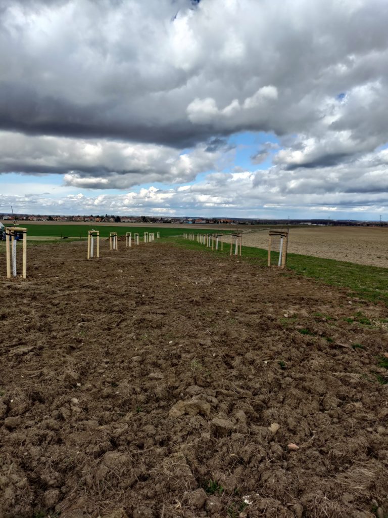V sobotu dopoledne 25. března 2023 jsme pokračovali výsadbou deseti ovocných stromů (čtyř jabloní a slivoní a dvou jeřabin) uprostřed současné aleje. Navázali jsme tak na úspěšné sázení, které proběhlo 17. listopadu 2022. Sešlo se nás celkem 13, z čehož sedm členů spolku. Pracovali jsme podle plánu a nezlomil nás ani ustavičný vítr a poněkud aprílové počasí. Stromky jsme zastřihli, ochránili před okusem a upevnili ke kůlům, které jsme zatloukali zatloukadlem. Po akci jsme si opekli špekáčky na ohni a brambory v popelu na cestě a ohniště poté zlikvidovali. Posbírali jsme dva pytle odpadků.