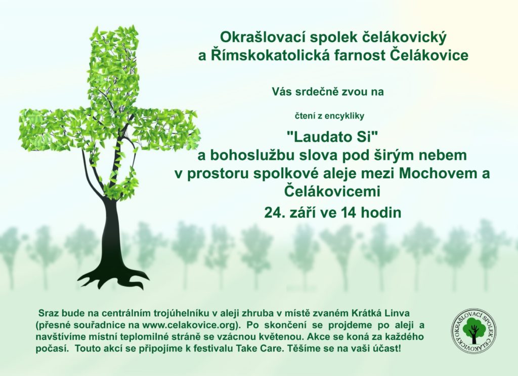 V neděli 24. září tak proběhne ve 14 h bohoslužba slova, kterou v 15 h vystřídá předčítání z encykliky Laudato Si. Sraz bude na centrálním trojúhelníku v aleji zhruba v místě zvaném Krátká Linva (50°09’04″N, 14°45’44″E). Po obřadě se projdeme po aleji a navštívíme teplomilné stráně se vzácnou květenou. Akce se koná za každého počasí a přidáváme se tak k festivalu Take Care v Praze a okolí. Těšíme se na vaši účast!