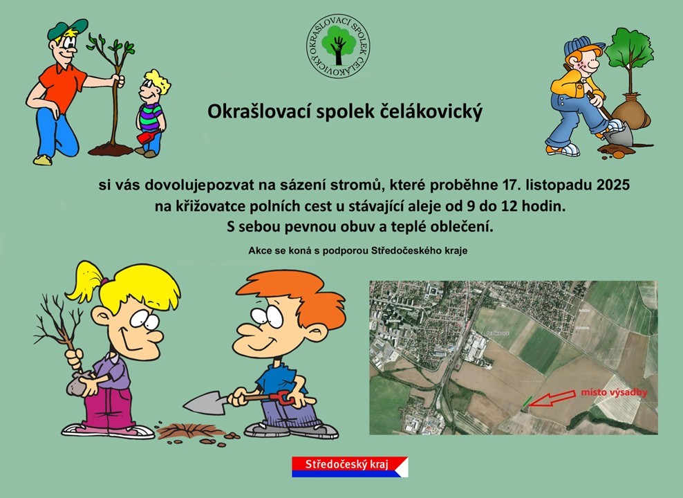 Sváteční den 17. listopad oslavíme dosadbou 12 ovocných stromů uprostřed současné aleje, kterou Okrašlovací spolek čelákovický začal vysazovat roce 2015. V roce 2018 byla nominovaná na Alej roku (https://alejroku.cz/2018/celakovicke-ovocne-stromoradi) a letos také na https://www.sazimebudoucnost.cz/akce/spolkova-alej