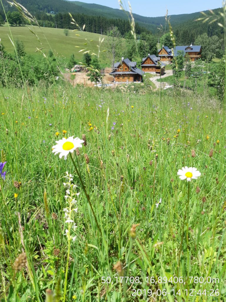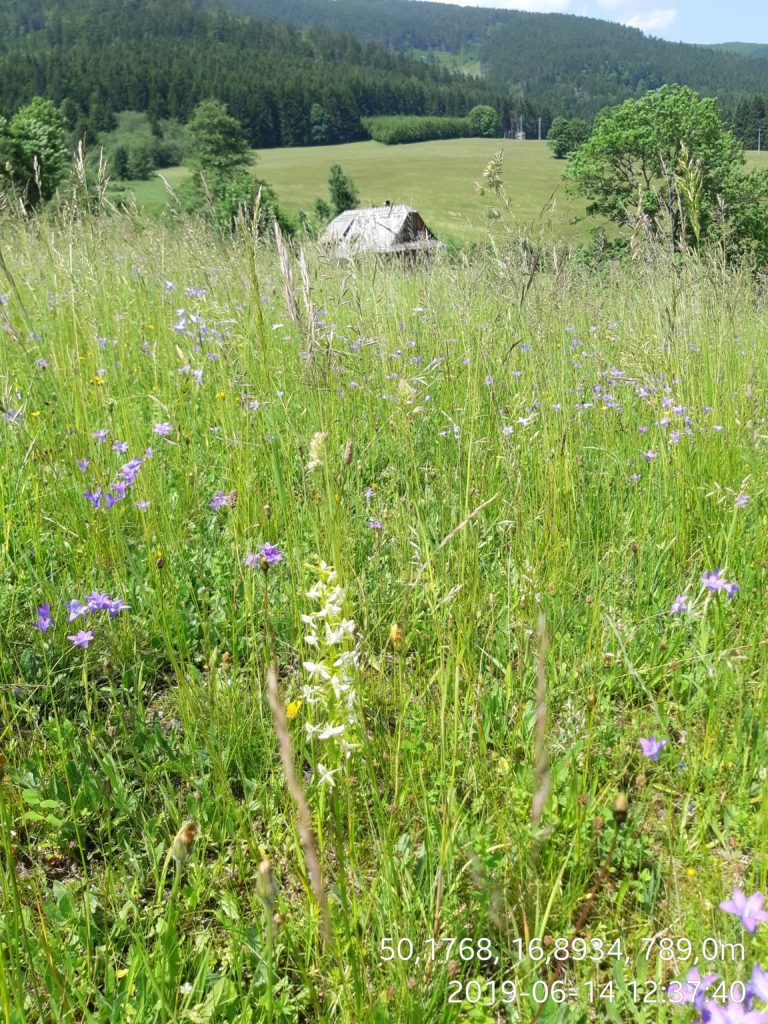Bíle kvetoucí vemeník dvoulistý na louce ve Stříbrnících, v levém horním rohu je chata Návrší.