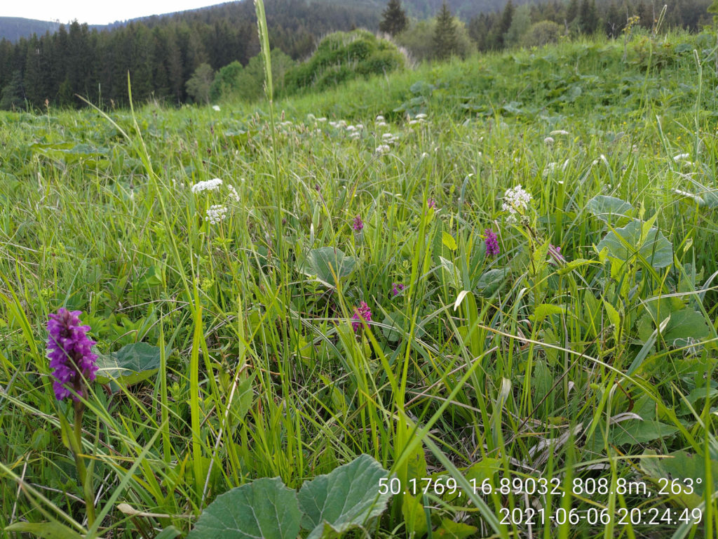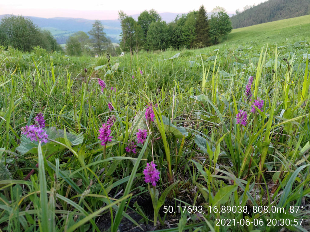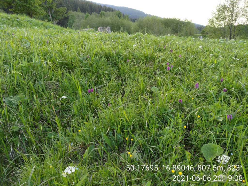 Podmáčená louka s kvetoucími prstnatci májovými z 6. června 2021, celkově zde bylo minimálně asi 240 kvetoucích exemplářů. Dnes je již nenajdete, byly zasypány a ČIŽP je již několik měsíců nechává dusit.