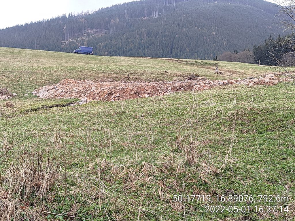 Rozhrnuté zbořeniště někdejšího domu do podmáčené louky s prstnatci májovými v roce 2019. ČIŽP OI Olomouc podnět odložil 20. 9. 2019 jako nedůvodný, poškození přírody nepotvrdil. Práce byly v roce 2021 rozšířeny a kolem 250 prstnatců je nyní zahrnuto kamením a cihlami.